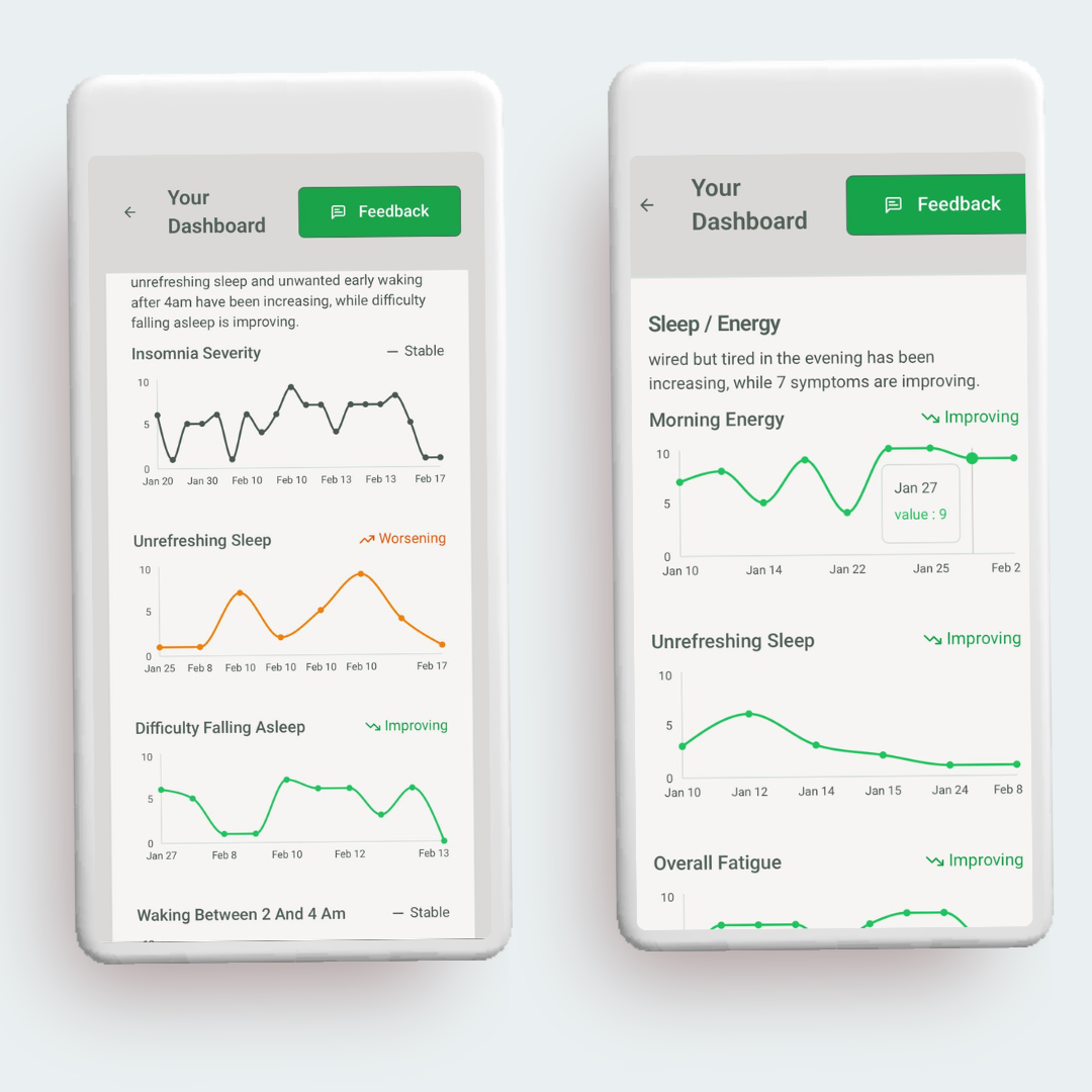 Your symptoms are grouped and summarized so you can see what tends to show up together, when it spikes, and what’s been most consistent over time.